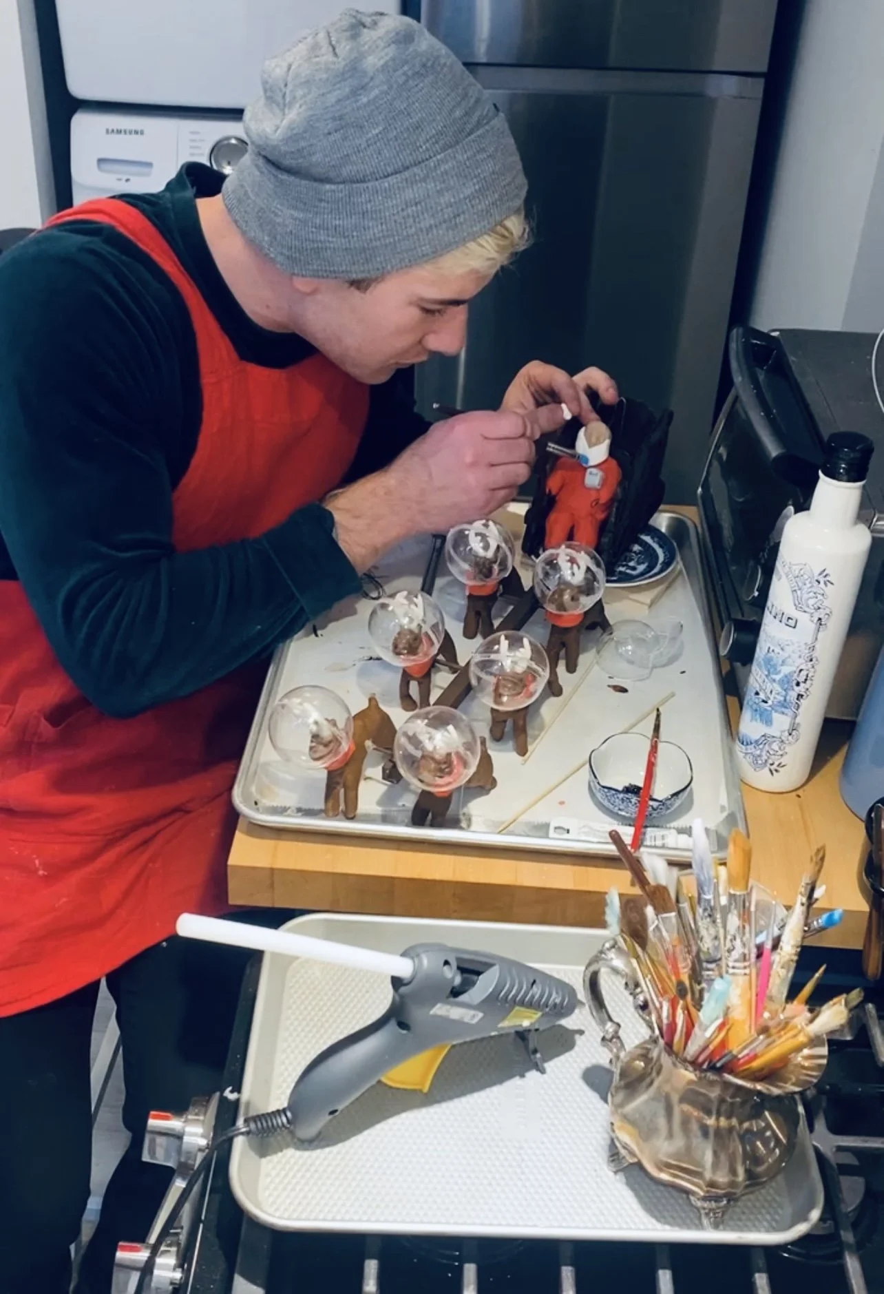 Hanging the space station was the most nerve-racking part of this entire project. First, I had to get the whole structure from my kitchen to my front room where it would be displayed in our bay window. No easy feat, as I live in a Victorian rowhouse with a meandering hallway, only 30” wide at its thinnest point, which meant I had the turn the space station vertically and carry it sideways. But before starting my shimmy down the hallway, I tied a loop of heavy duty cable wire around eyehooks that I had fastened to the metal arm structure of the space station. Once I complete the journey from the kitchen, a tall friend on a ladder helped loop that wire around a hook in the ceiling. We backed away slowly and gently let go until the space ship was suspended in space!